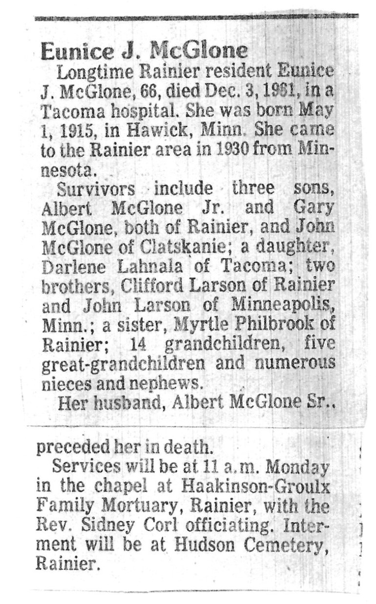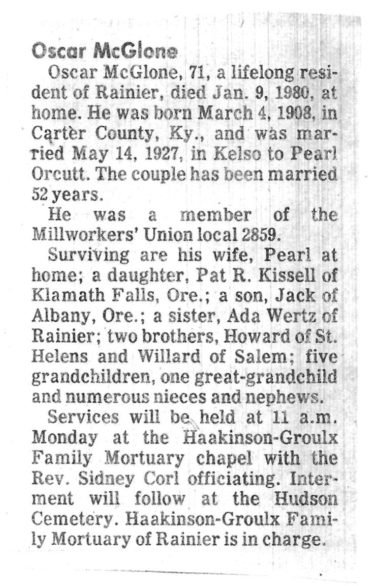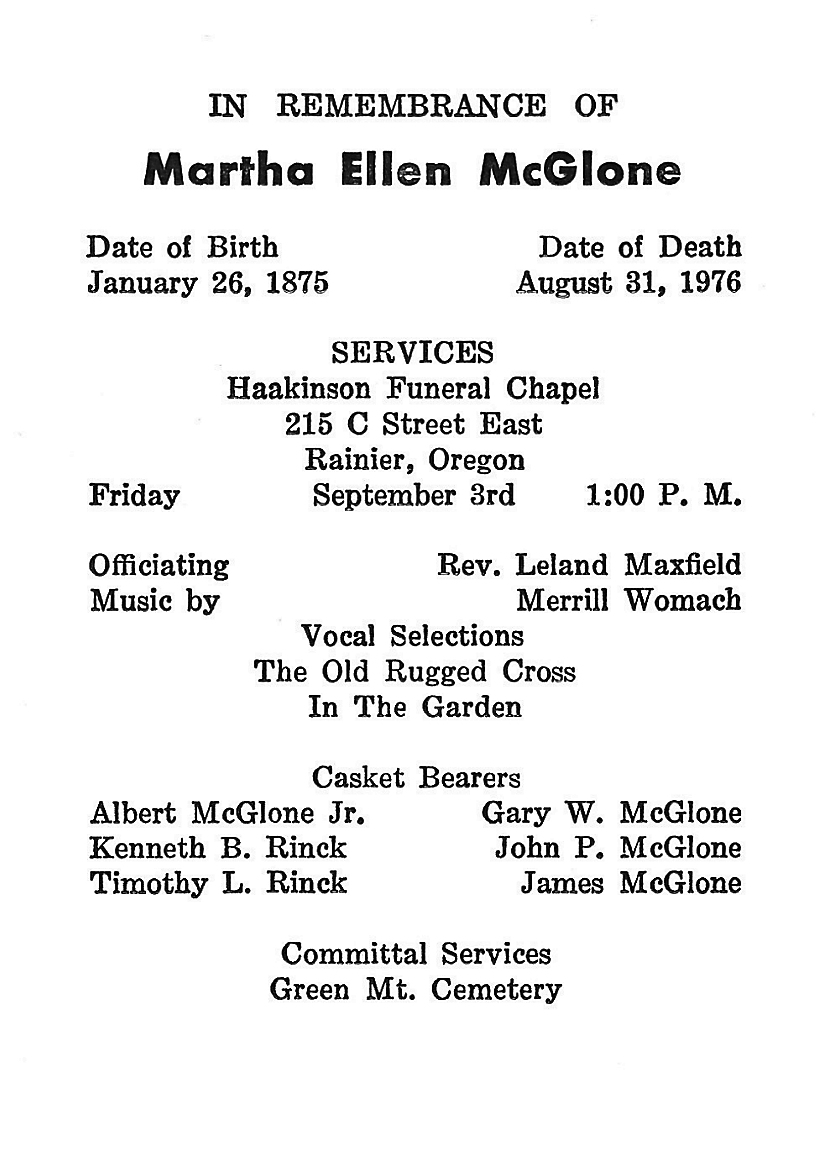 Died: January 9, 1980 in Rainier, Columbia County, Oregon Funeral pamphlet.