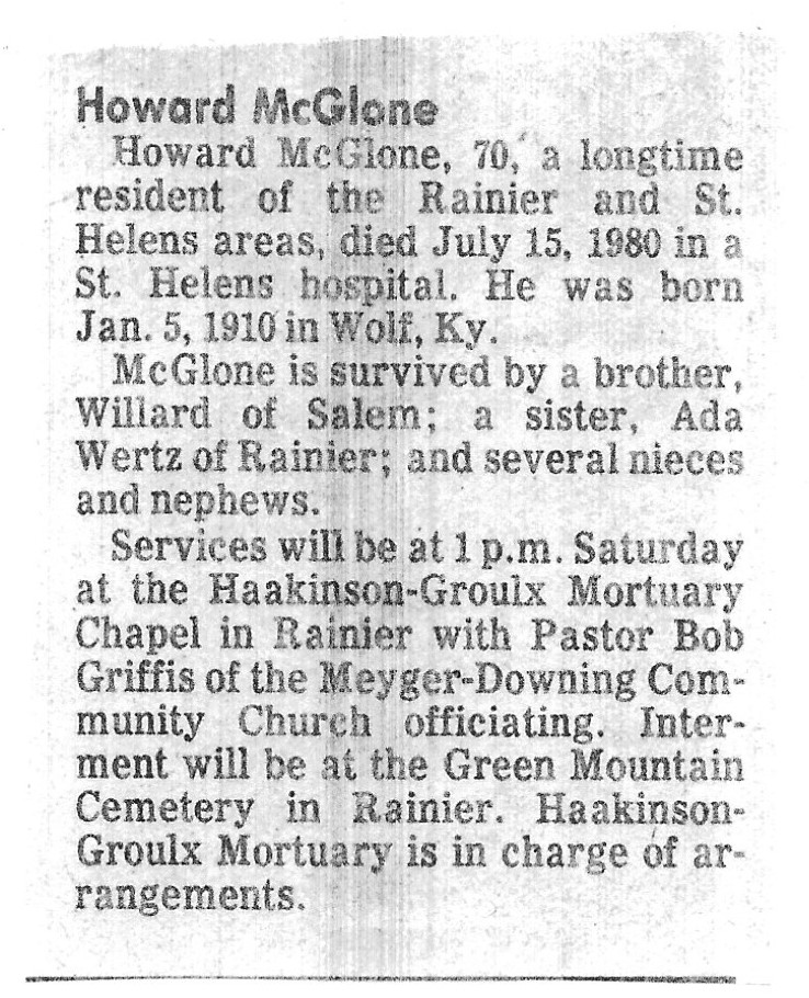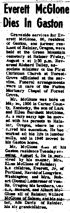 Obituary: from the Rainier, Oregon Review August 10, 1972