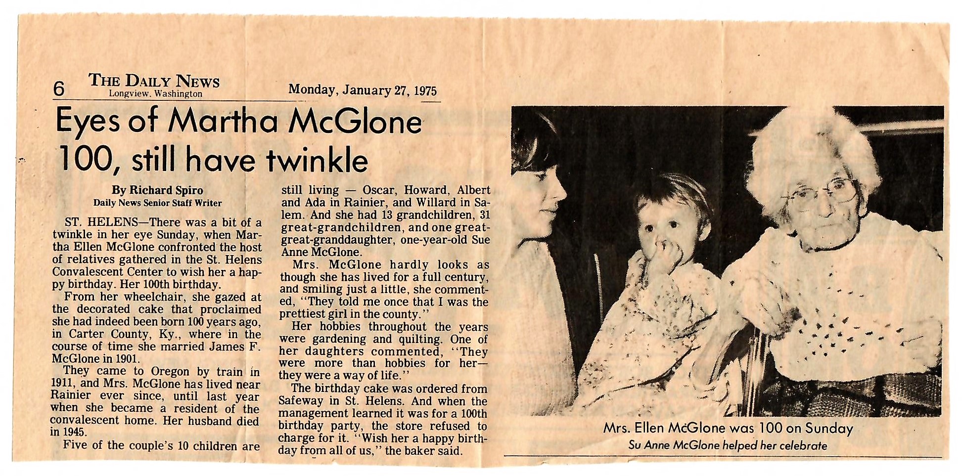 Born: January 26, 1875 in Carter Caves, Carter Co., Kentucky. Celebrating her 100th birthday