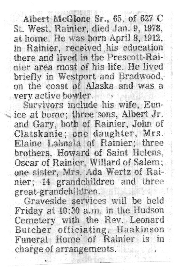 Died: January 9, 1978 in Rainier, Columbia County, Oregon