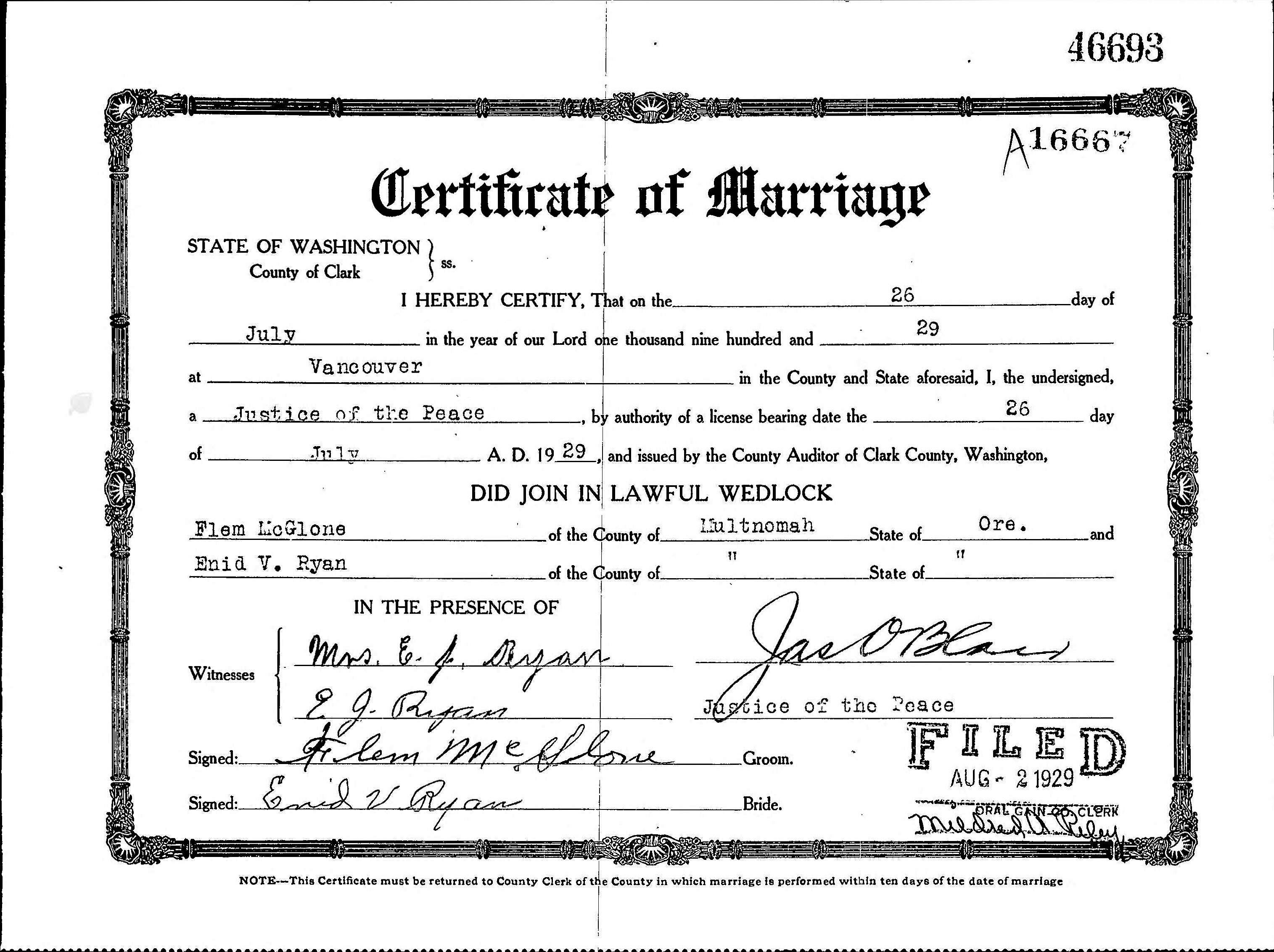 Married: Enid V. Ryan on July 26, 1929 in Vancouver, Clark County, Washingtion