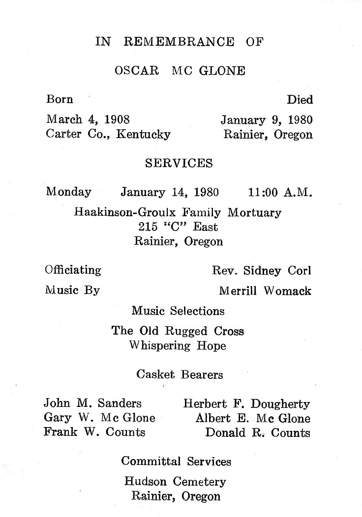 Died: January 9, 1980 in Rainier, Columbia County, Oregon Funeral pamphlet.
