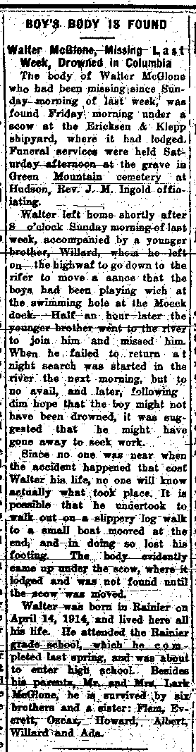 Obituary: from the Rainier, Oregon Review June 2, 1938